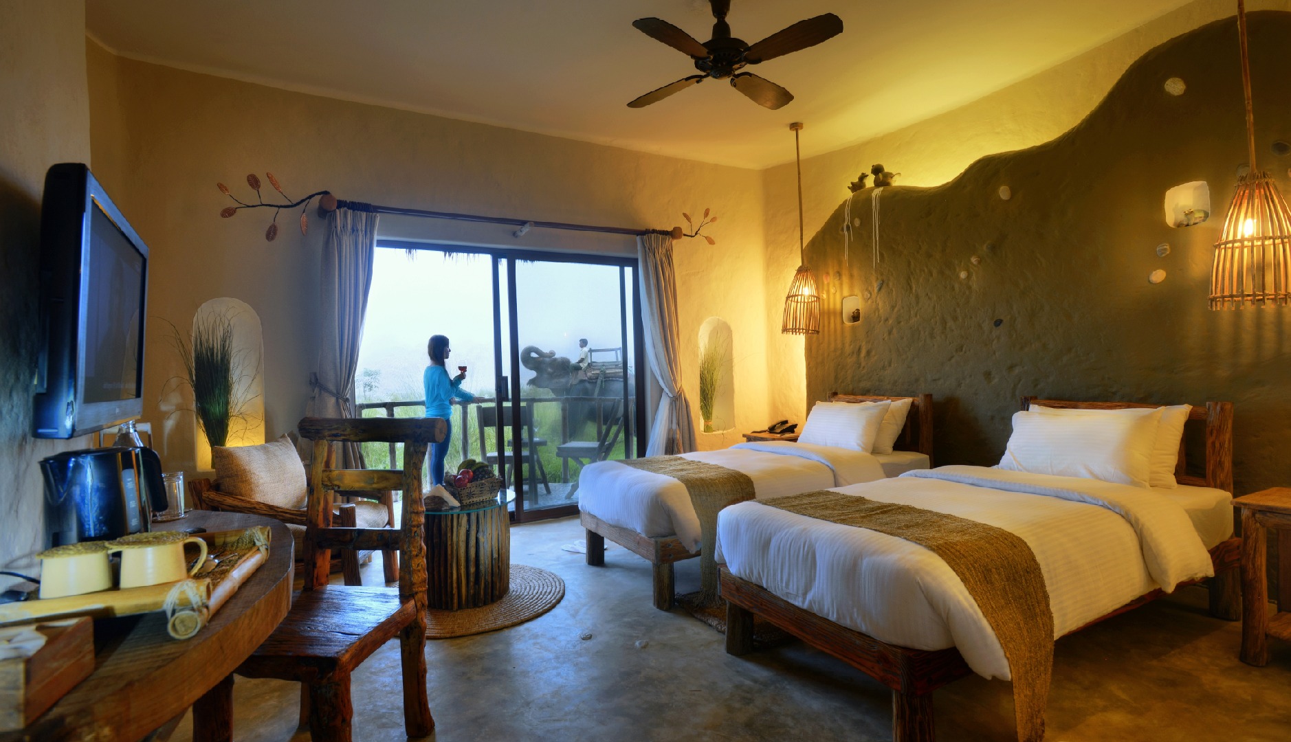 - Spread over 30 acres, the lodge offers 35 boutique en suite rooms, built as individual and two-in-one private villas or suites. The rooms open up to a balcony with a sit-out overlooking the forest and the river. Beautifully designed with a rustic blend of contemporary and traditional Nepali furnishings with indigenous skills, used wood, bamboo and elephant grass.